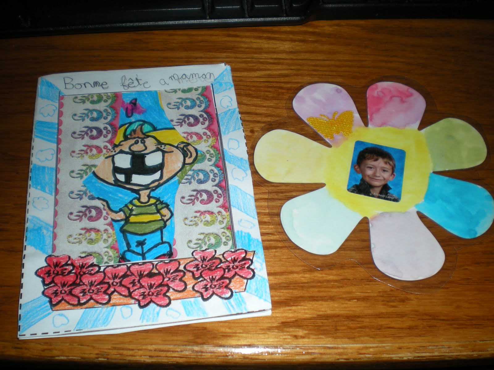 This is the outside of the card he made at school and the flower. I told him that I plan on making the flower into a magnet for the fridge. He thought I was going to use it as a bookmark but I told him that its too pretty to use and I want to show it off so the fridge is a good place for it.