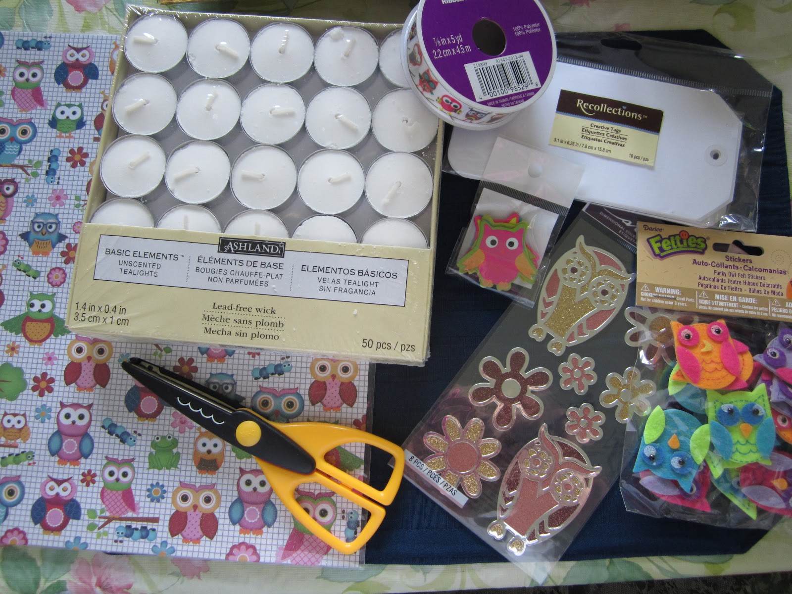 I also grabbed some tealights for my wax burner. Along with a bunch of Owl items such as the ribbon which are going to be bookmarks eventually when I get the pieces I need along with some various stickers, scrapbook paper and the scissors. I also spotted the creative tags which I am thinking of doing something bookish with them.