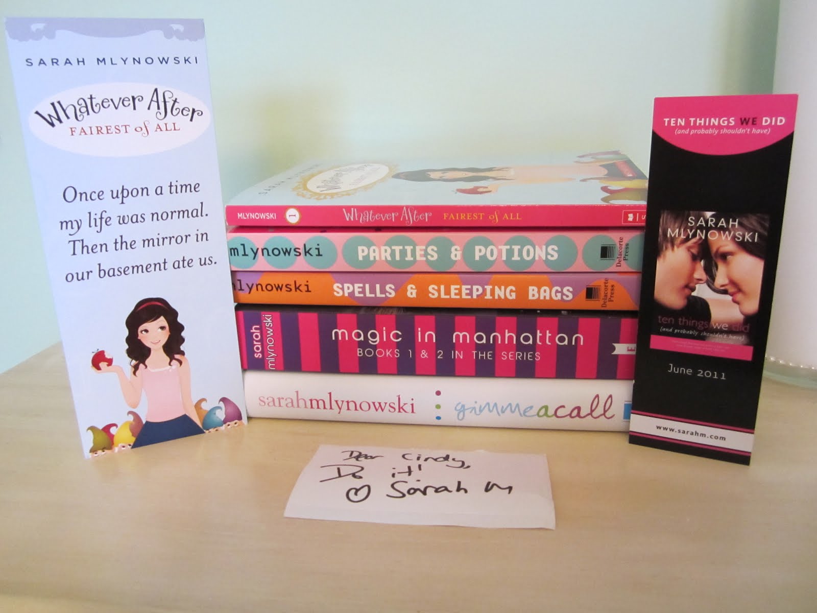 I love the book marks that Sarah was giving out and I actually owned Gimme a Call and Whatever After so I brought them to get signed and ended up buying Magic in Manhattan, Spells & Sleeping Bags and Parties & Potions. Sarah graciously signed a label for me because I have her book Ten things but I think I packed it away so when I unbox it I will put it in.