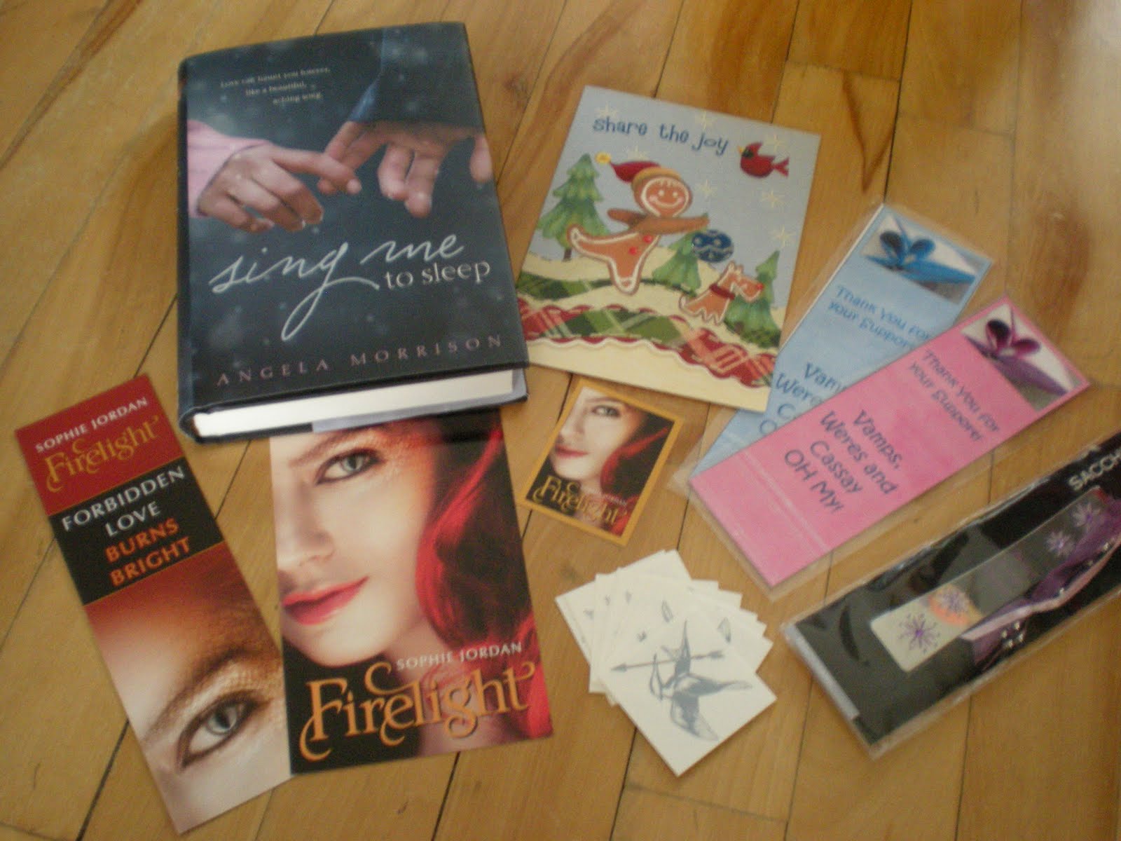I got a copy of the book Sing Me to Sleep by Angela Morrison which has been on my wishlist since I first heard about it. It sounds really good. I also got two of Cassay’s own bookmarks, a beautiful Christmas Card, some Hunger Game tattoos (which were tucked into several places in the book), some Firelight swag (card, bookmark and sticker) and a pretty bookmark.