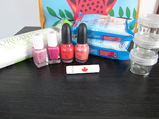 The loose items in the bag were a package of organic cotton wipes, two packs of facial wipes (which always come in handy for nights I am feeling too lazy to remove my make up), three plastic containers to put items in, a lip balm, two L’Oreal Paris nail polishes (330 Fleur de Lis & 260 Wishful Pinking and two Sephora by OPI (Lost without my GPS & How Cute Is That?)
