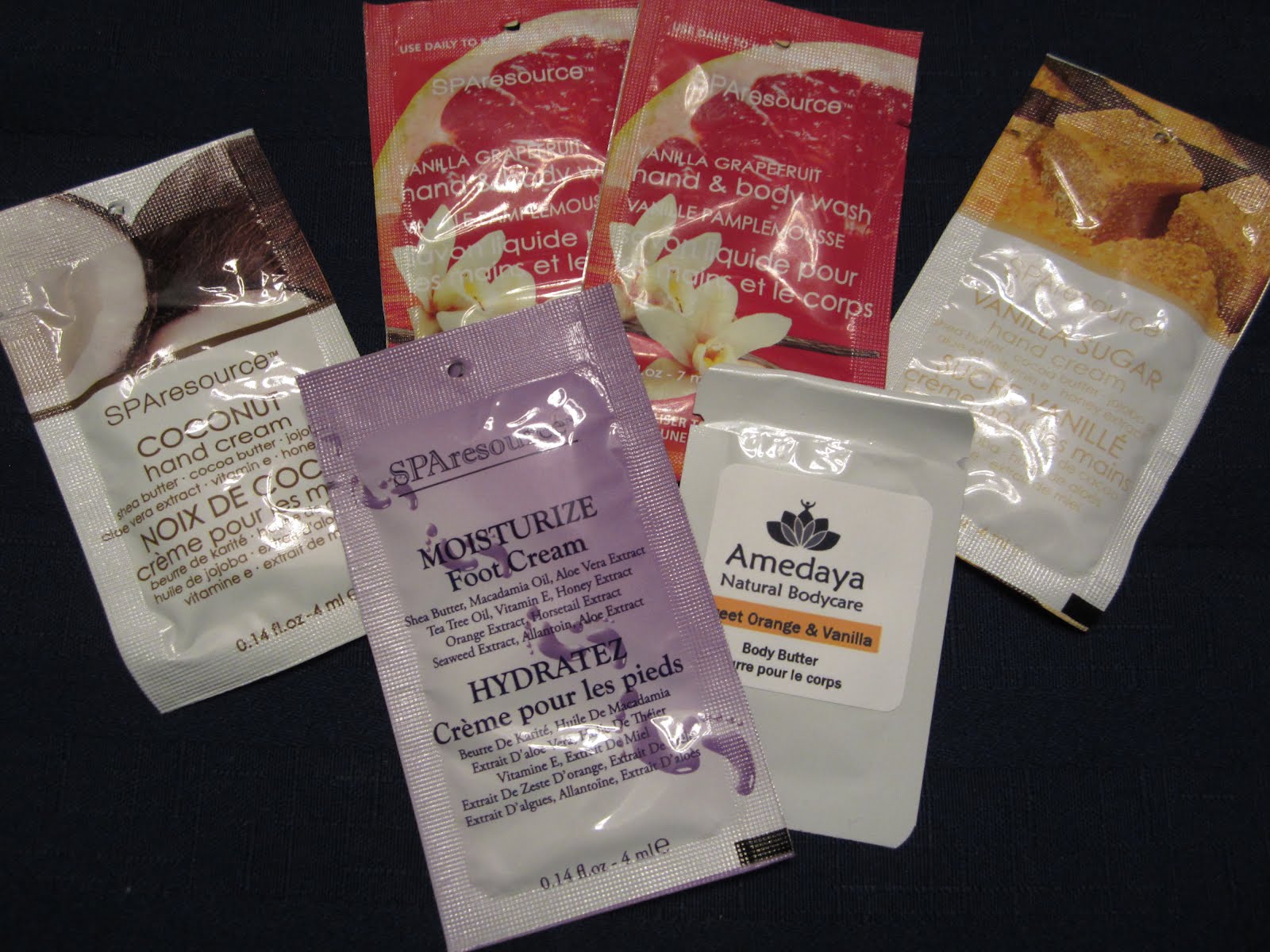 Spa Resource with included a coconut hand cream (4ml) vanilla Grapefruit hand & body wash (7ml) x2, vanilla sugar hand cream (4ml) and moisture foor cream (4ml)