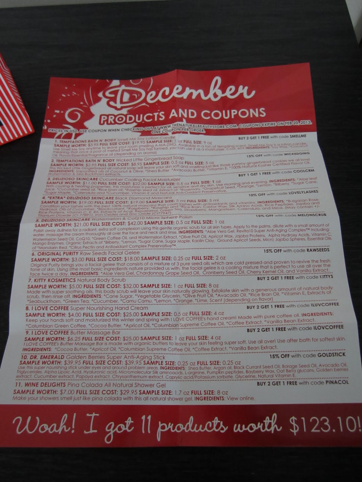 - Overall Beauty Minerals sent a mineral eye shadow. This had to have the cutest packaging of the box. it came in a wax paper kind of package. The shade I got was mink. It seems like a nice shade/ The sample is worth $3.30 for 3grams and the full size is $5.50 for 5grams
