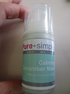 The first thing I pull out is something that is new to me, its called Pure + Simple. Its a calming cucumber mask. Its an all natural skin calmer. It includes all natural ingredients.